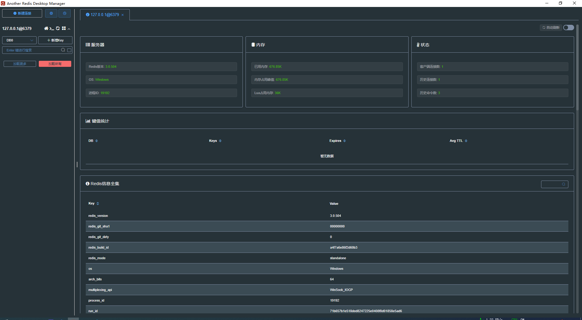 连接上 Redis 即可显示选中 DB 中所有的 Key,以及当前 Redis 的状态。还可以以可视化的方式创建不同类型的键值对,当然也可以直接使用命令 非常方便